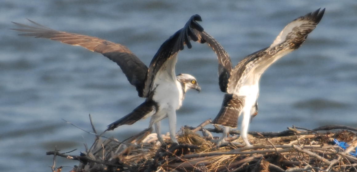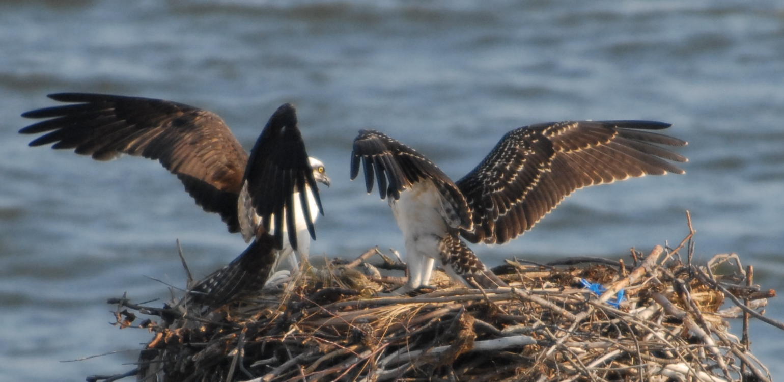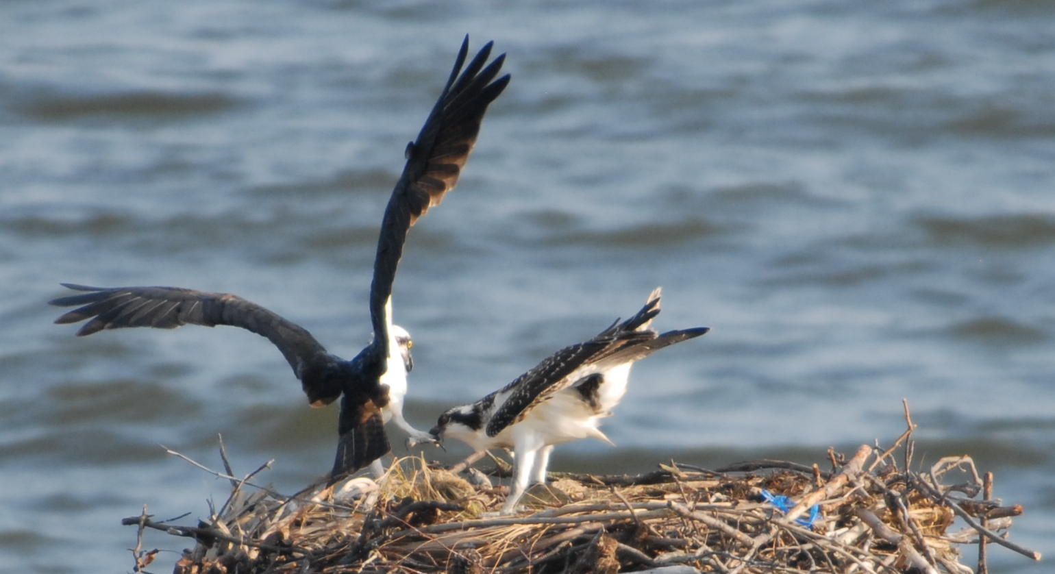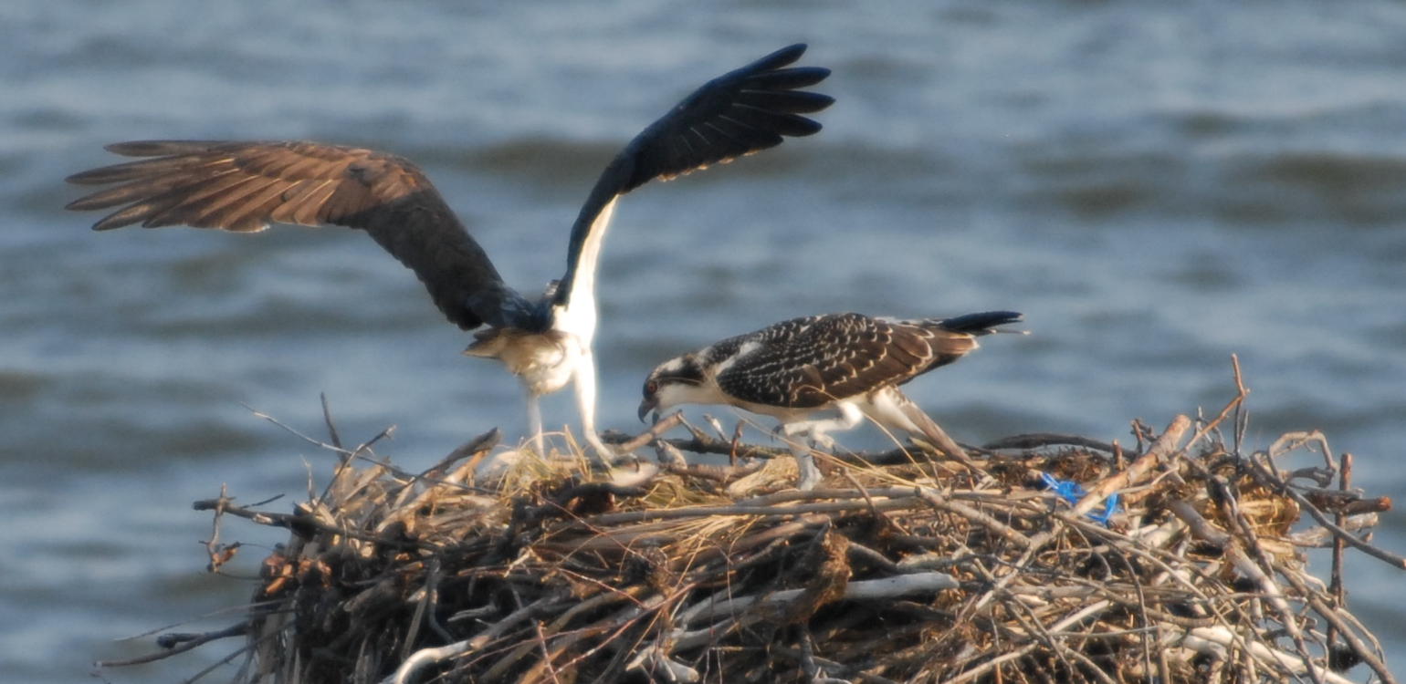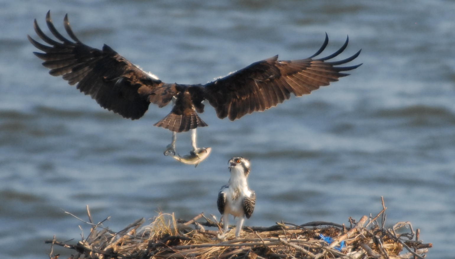 What strength the chicks have attained since fledging less than two weeks ago! Finally, tonight I got some shots of mom Olivia bringing in a fish to one of the chicks.