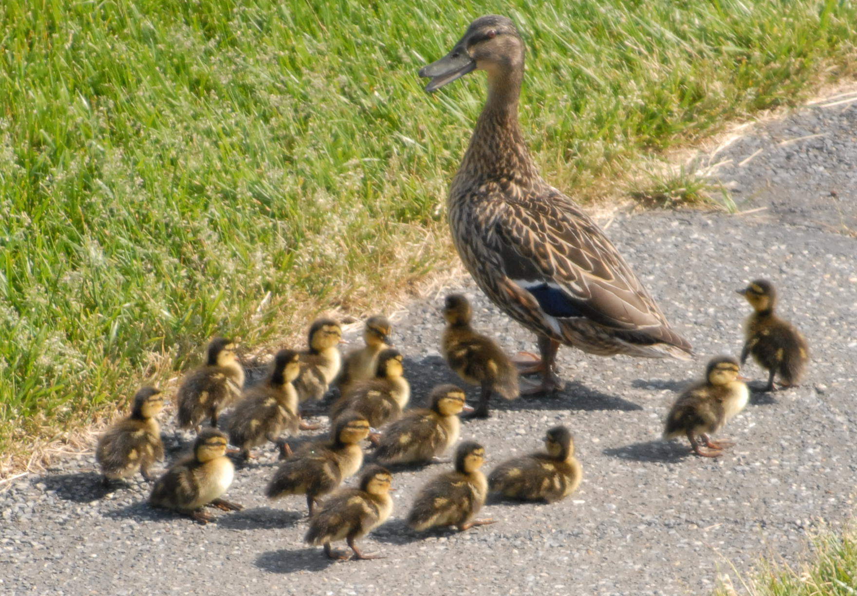 Finally, I thought this was nice. We had a momma mallard duck and her 15 ducklings swim across to our grassy area under the osprey nest from Chesapeake Bay Environmental Center, spend 15 minutes hiding in the flowers, and then she quacked them back over the berm and into the water for the long swim back to CBEC. Those poor little ducklings had a rough time climbing up and down the berm rocks, but they all made it! Here’s their family photo…
