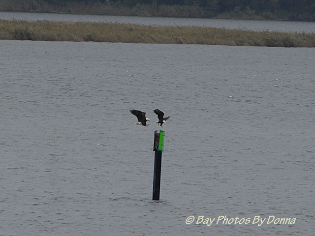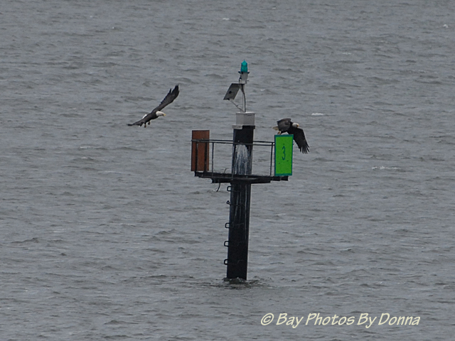 When they took flight, they flew over to Kent Narrows channel marker #3 where two other eagles were perched. They interacted a bit and then separated, two flying back and going over to CBEC to perch while the other two perched briefly on channel marker #5 before flying out of sight. I tried to captured all four in a single photo but lucked out with three.