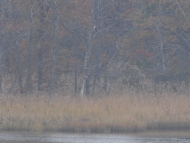 There was another osprey sighted in our area this past Sunday! I spotted this one resting about 8:30 a.m. in a tree over at CBEC. At such a distance and being perched in the shade from the rising sun, my enlarged shots are not that great but you can see him! I watched him for a half hour with binoculars when he then flew over to Marshy Creek and dove twice, being successful the second time. He then flew away in the distance with his dinner. I haven’t seen him since. I could not tell if this is the same one from my November 6th sighting, he never flew over close enough for me to get a look at his tail to see if he was missing a couple of feathers. Nor could I get a close enough look to see if it was an adult or juvenile osprey. Here are three photos.