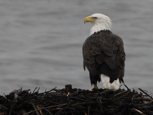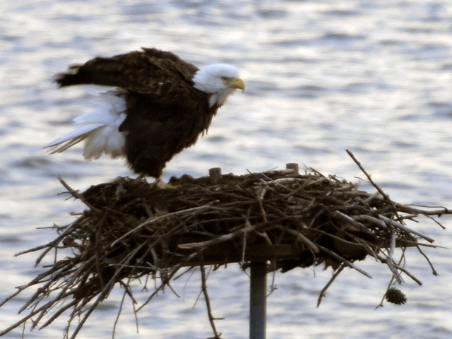 Our cold winter has arrived, along with the influx of migrating waterfowl of all kinds. Within sight of our nest, we have had geese, buffleheads, loons, redheads, tundra swans, canvasback, ruddy ducks, and more swimming and searching our calm shallow waters for food and shelter. In addition, our nest continues to be a regular perch for a pair of eagles that nest over at CBEC. What a beautiful, patriotic sight they are! Here’s a sequence of photos of one of them fluffing his feathers in the cold brisk wind.