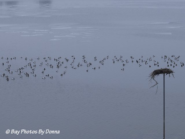 It just seems impossible February is already here. But it means we are another month closer to Spring and the return of our osprey mid-March! This past week’s activity around and on our osprey nest provided some great shots to share with you. Last Sunday at low tide, I watched a couple of Buffleheads and tried to capture shots of them diving. Here’s an interesting quick sequence of one going down to feed, with a later shot of a water shake-off & stretch!