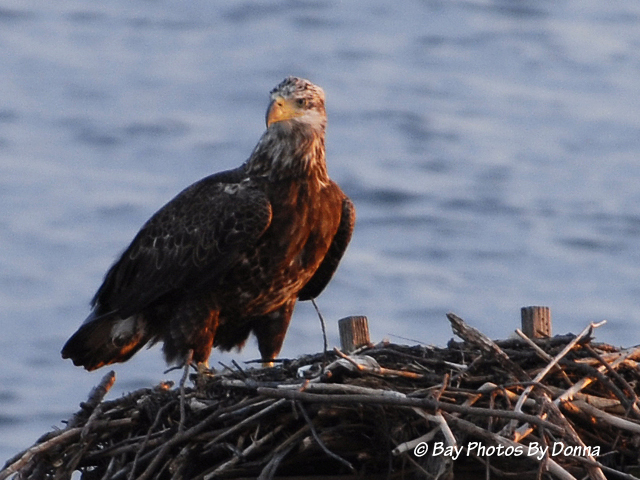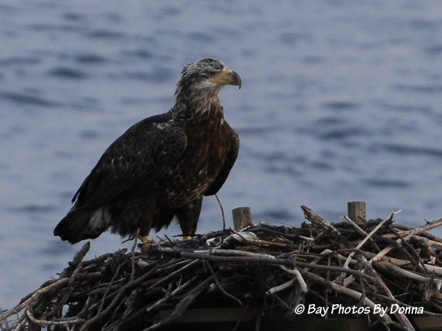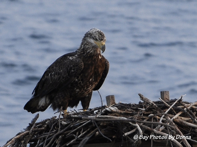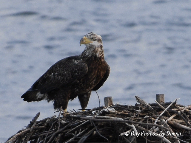 Finally, Wednesday I was lucky to capture a sub-adult bald eagle visiting our nest. He appears to be approximately 3 to 4 years old. Young bald eagles are blotchy and do not obtain their distinctive white head and tail with dark brown body until the age of 5. Eagles can live as long as 30 years in the wild but average about 15 years.