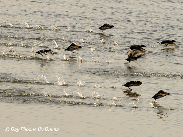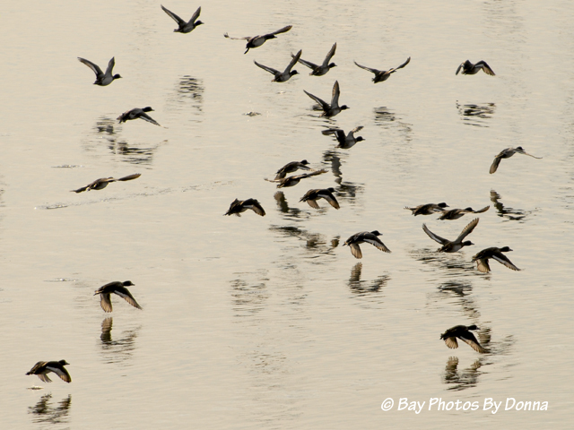 That same day a raft of Lesser Scaups were out beyond the nest. One made a decision to take flight, followed by the rest….