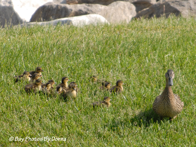 May 16, 2010 – Up and over the berm rocks the little ducklings fell as momma coached them along.