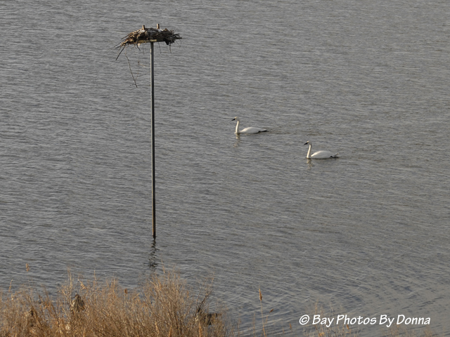From 50-60 degree temps to two inches of snow, what a week of teasing by Mother Nature! This week we had those cute little buffleheads diving around the nest and berms almost daily, there must be some good feeding at the bottom. Canadian geese are making their way through our area as well as they head back north. Earlier Tuesday morning I watched a lone male greater scaup casually swimming along the berm, rounding the osprey nest.