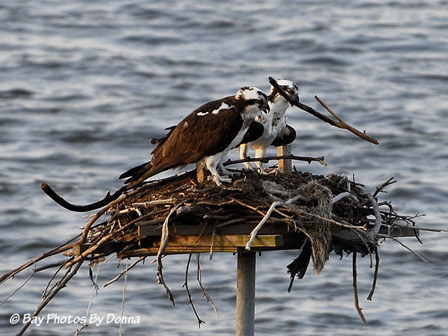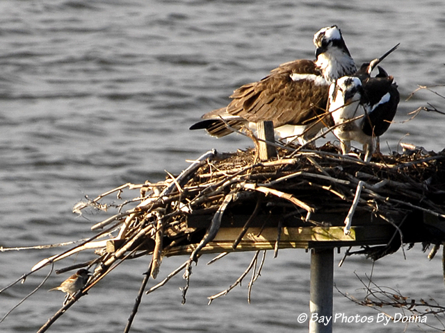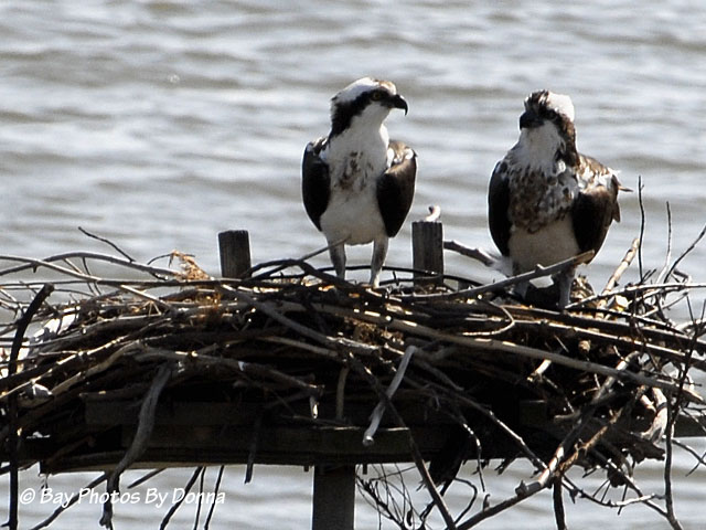 To help identify Oliver and Olivia, the next photo shows their size and the chest speckling. The female osprey is larger than the male and usually has more chest markings. Our Olivia is on the right, Oliver on the left.
