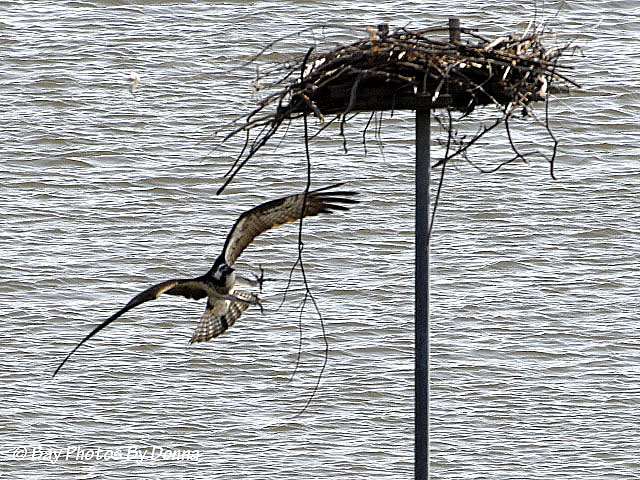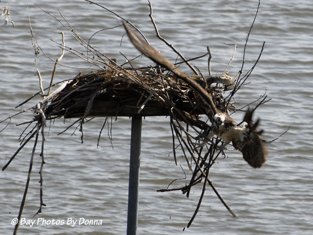 She luckily pulled away and off the nest, leaving an entangled section hanging. She came right back to the nest and started to rearrange when the section went crashing into the water below.