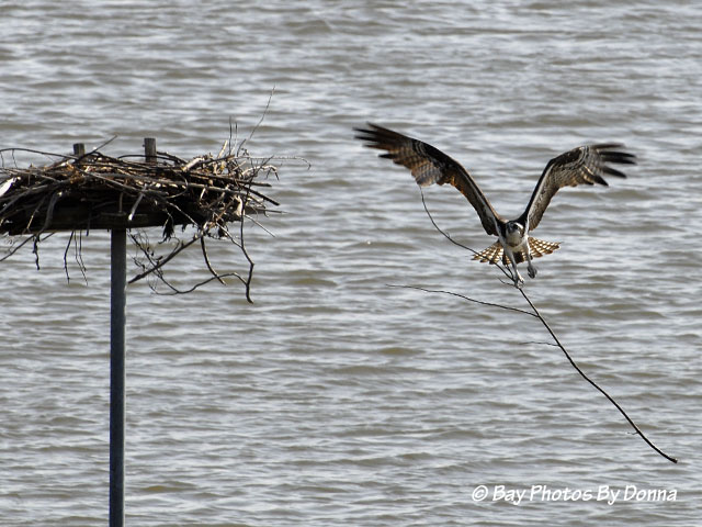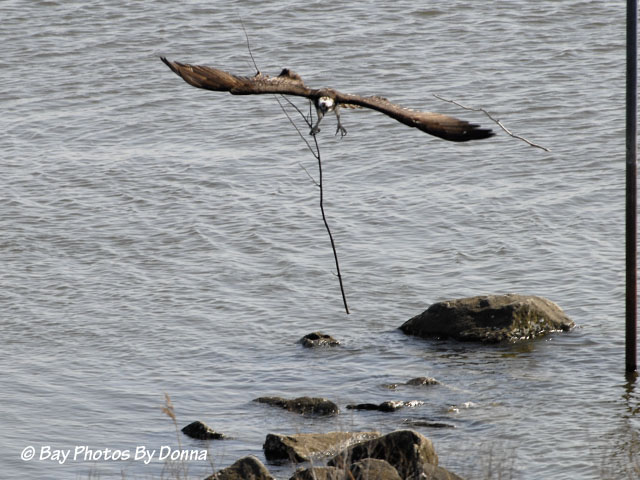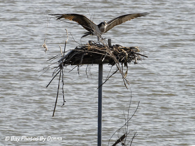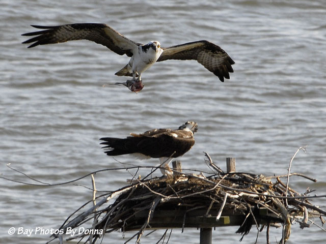 Olivia peered over the side at the water below but didn’t attempt to retrieve them. I think she had had enough of that for a while! Oliver showed up shortly thereafter with dinner, which she took quickly and flew off to eat alone. Notice Oliver ate the head of the fish before bringing Olivia her portion.