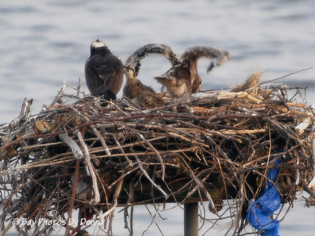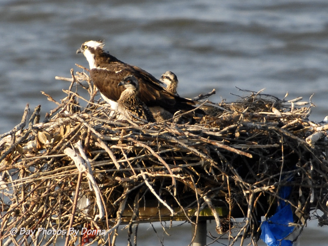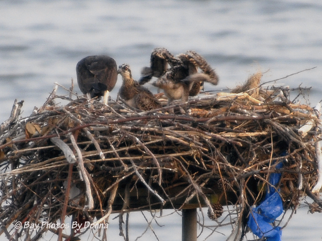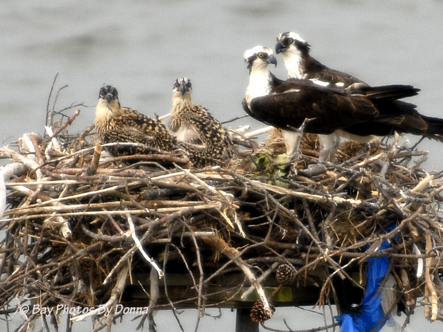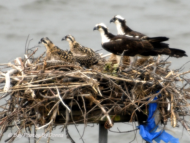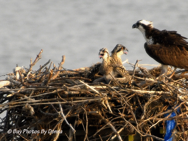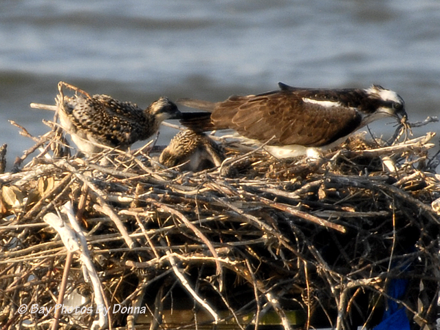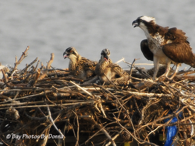 Trying to capture a ‘family portrait’ is not easy with ospreys once the nest becomes crowded with growing babies. But this evening I finally got some where everyone was there and in great position. 🙂