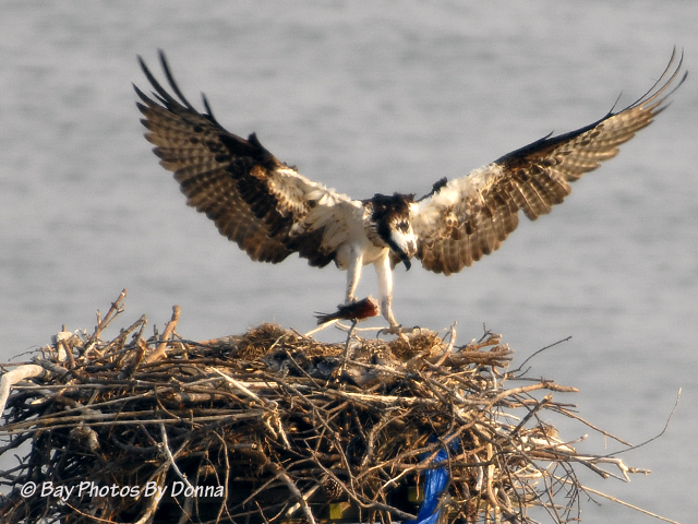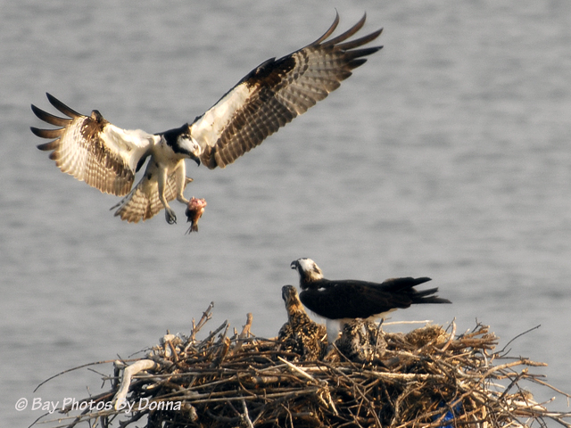 The next two photos shows Olivia returning with a fish that she had been feeding to the chicks. She had felt threatened by a passer-by with a dog and wasn’t taking any chances, she just circled around until they left. In the first photo, I wanted to point out Olivia’s wing (left in the photo) shows a feather growing in which I had previously mentioned was missing a couple weeks ago. Wondering if she had been in a fight or entanglement, or worse sick, I had discussed the previous photos with Lisa at Blackwater Refuge and she thought it could be that Olivia was molting, which the females will do before their chicks fledge. Now seeing the feather growing in confirms the good news!