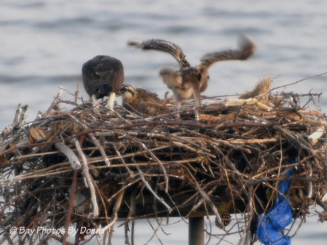 What a humid, hot week our osprey family experienced so early in the season. As the week progressed, temps reached in the upper 90’s, and the afternoons were just too hot for our little ones to do much more than try to get under mom Olivia’s spread wings to get out of the sun. They enjoyed the early mornings and early evenings more, and were up and active then. Of course, they aren’t so little any more as photos continue to show their rapid growth from week to week.