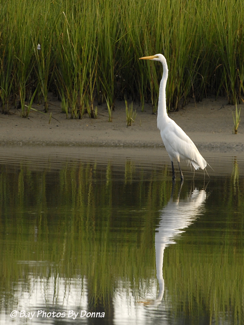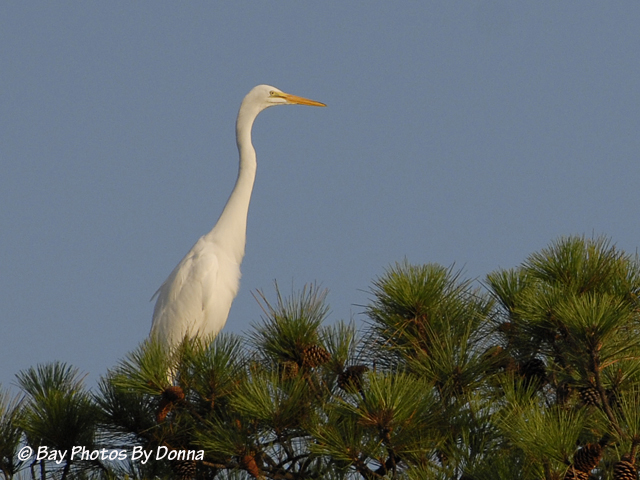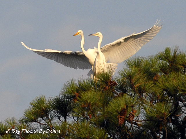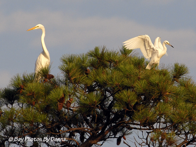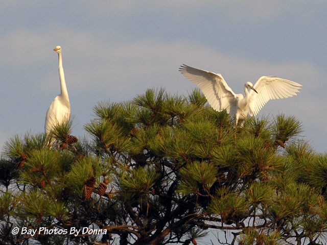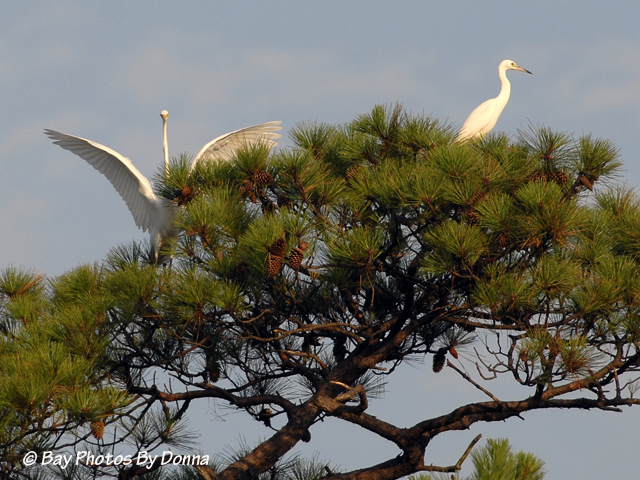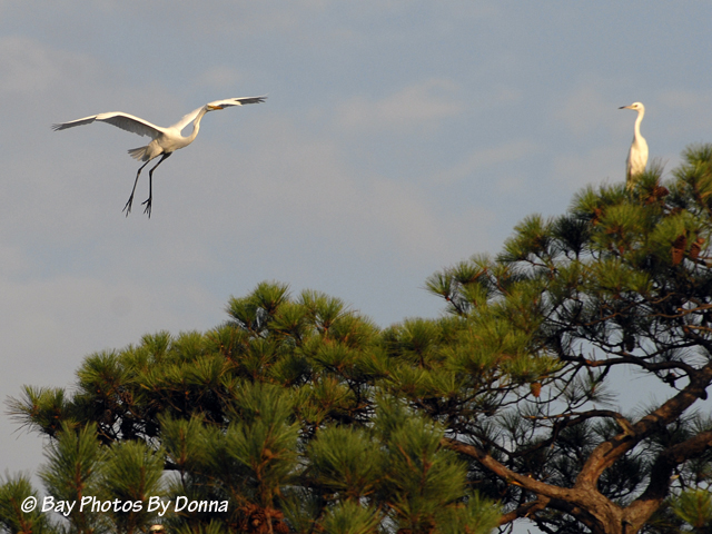 We visited friends who have a beach house along the Nanticoke River; and this morning I was lucky to capture the following photos of a protective mother Great Egret with her baby high in a pine tree, as well as another adult Great Egret along their pond.
