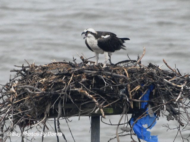 Up until this morning, our nest has appeared to remain empty and quiet as I continued to keep an eye on it, along with a few community neighbors. However, this morning at 6:45 a.m., I heard an osprey calling loudly and glanced out at the nest to see an osprey perched on it. He stopped calling for a bit, and just kept looking around the area. He didn’t seem to mind me as I was quickly moving around on my balcony trying to defog my lens and capture a clear shot of him. Another osprey appeared up over to the left of the nest, and the perched osprey started a threatening chirp loudly, causing the flying osprey to leave. He remained on the nest for 15 minutes before flying off and out of sight.