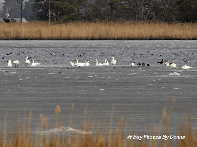 In the first photo shot across Marshy Creek from Discovery Lane, I was able to count eight species of waterfowl — tundra swans, Canadian geese, coots, buffleheads, canvasback, and three others I couldn’t identify. (I actually took a one-night class offered at CBEC last fall called Waterfowl I.D. and I continue to learn as I go along!)