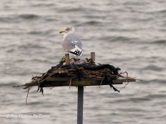 Finally, a couple shots from today. This morning this gull was keeping tabs on the nest, squawking at any other gull that tried to come too close. I wanted to show the condition of our osprey nest. The winter winds and visitors picking at it has reduced it to almost nothing. Oliver will have his work cut out to rebuild it when he returns, which we know he’s one great architect. His building materials have always been interesting, as he has a love for items and plastic in addition to sticks. Notice the boat line and black plastic embedded in the nest? LOL Last year, he even brought a McDonald’s bag to use!