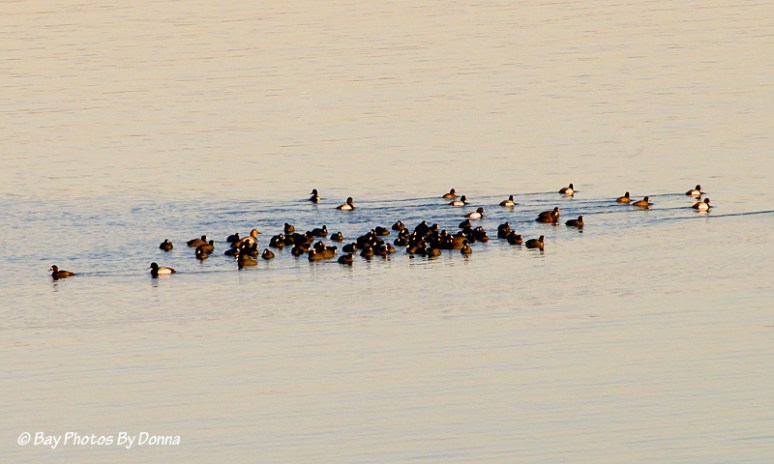 After a few photos, the coots about-faced and went back towards more of the center of Marshy Creek and mixed in with a small group of scaup, diving and feeding together as the sun set.