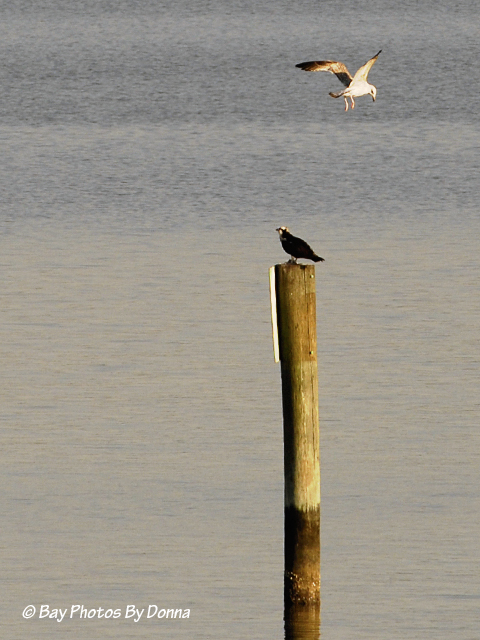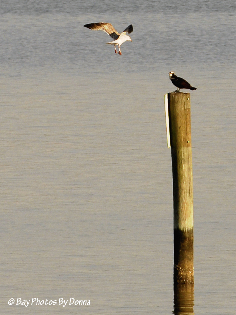 And just then a gull came swooping down to the osprey to check out what the osprey was eating. The osprey just looked at the gull….