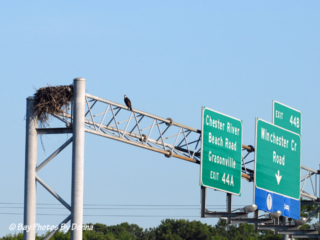 About five miles from us along Rt. 50 (BUSY dual highway, three lanes each way), there are two osprey nests that are directly over the highway on road signs that I’ve discussed in past seasons. Long story short about these two nests, I tried to get the Maryland Dept of Transportation to remove the nests February 2011 prior to the ospreys’ return to force them elsewhere and hopefully away from the highway where we lost a chick in 2010 from a direct hit by a vehicle while it was learning to fly. Because the nests did not block the lighting of the signs and were not a safety hazard, MDOT wouldn’t do anything about them. So I worried for those two families all last season and will again this year. Anyway, this morning as I checked out these two nests while passing by them, there was an osprey on one of the signs eating a fish. 🙂 Here are photos from 2010 of these two nests, and almost exactly where I saw the osprey sitting this morning on the first one. I was excited, another osprey in the area!
