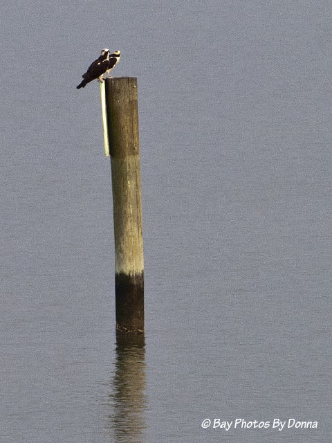 This morning before daybreak, I found our osprey pair sitting on Lippincott’s channel marker. This evening at 6:30pm arriving home, no osprey in sight. But from 7 to 8:15 pm until I could no longer see, both were on the channel marker again, preening their feathers and chillin’. At times, and I’ve seen this since they each returned, one will hang it’s head down for a while catching a little nap and rest. With the cloudy day and lateness, the photo’s not the best….