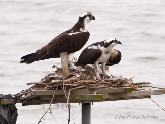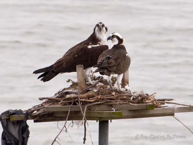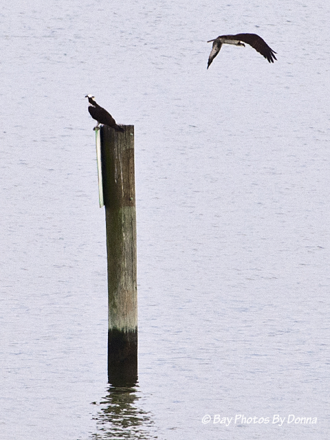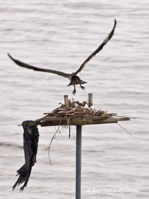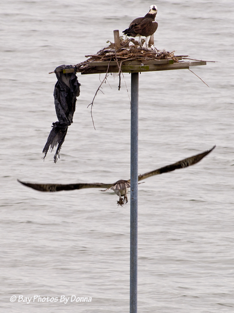Arriving home yesterday and today, an osprey was on the Osprey Point platform; minutes later when getting home both our nest and the channel marker were empty.