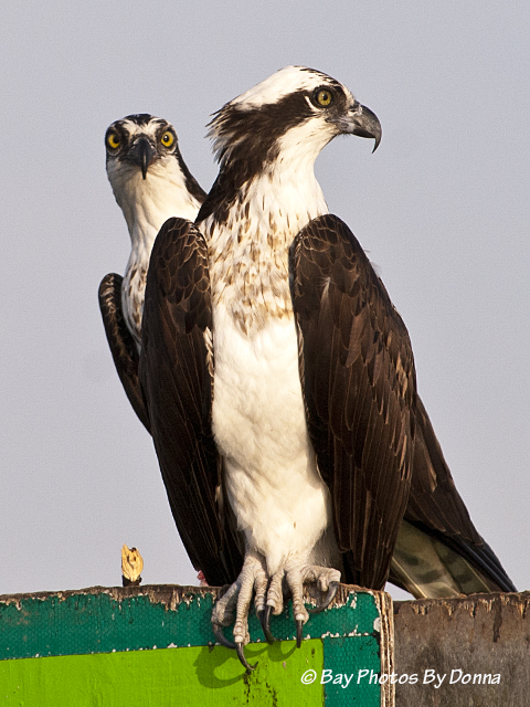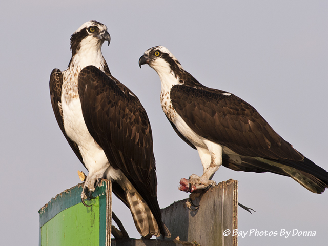 Osprey are really quite tolerant of us humans, and those that nest and perch along channel markers in our area usually will stay roosted and watch you as you pass by them. Sometimes the younger ones will chatter a threat at you but they won’t attack. These two just watched us as we slower cruised by them. The male has the fish.