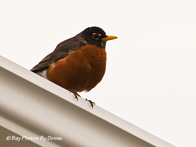 Of course, the American robin is everywhere, busy getting nesting materials while protecting their territory from the other birds. This fella was taking the high perch on the gutter and keeping an eye below…..and on me while he sang his song.