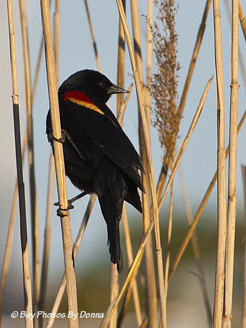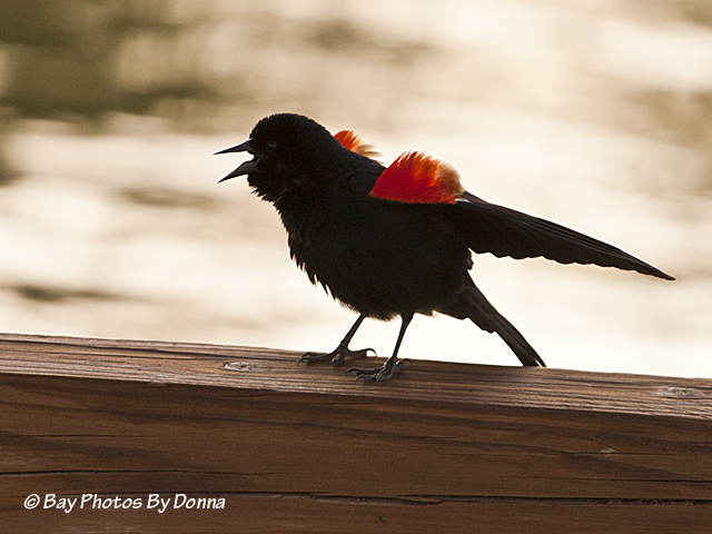 Another morning, from the car I was shooting some type of flowering tree by the marina and didn’t realize a red-winged blackbird was sitting within 10 feet of me on the dock. He started singing and I turned and shot a few. I liked this next photo the best!