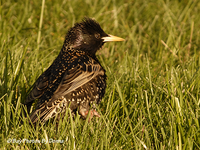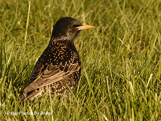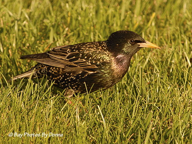 That same morning, the next photos were shot at eye-level from my car as this starling sat and fed on a mounded grass hill.