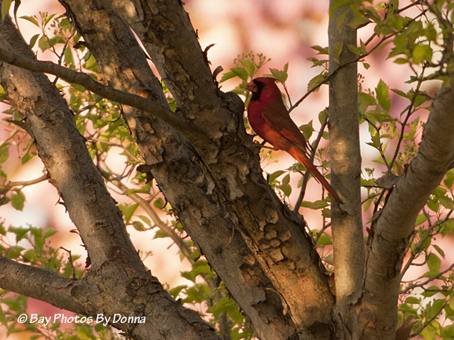 Both yesterday and today, I looped before and after work around our community’s marina in search of that Northern Cardinal that had eluded me the previous days. I was hoping he was a resident and just wanted one good shot of him if I could. Yesterday as soon as I turned the corner, I saw him. 🙂 I stopped and stayed still as he flew from tree to tree. What a flighty bird! Once he seemed to feel he was far enough away from me, I decided to try to photograph him from my position instead of moving the car more or getting out. I’m glad I did, afterwards he flew out of sight. But I got him!
