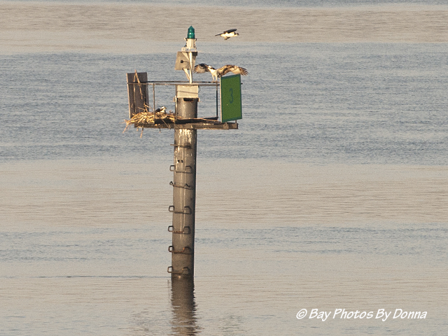 The first photo I’m sharing is one of those three nests, on the Kent Narrows south entrance channel marker #3. While watching them, a third osprey flew past me with a fish, and headed towards the pair on the marker, which caused a bit of a ruckus. All that open air space, and he had to fly by that close to the pair. Too funny!
