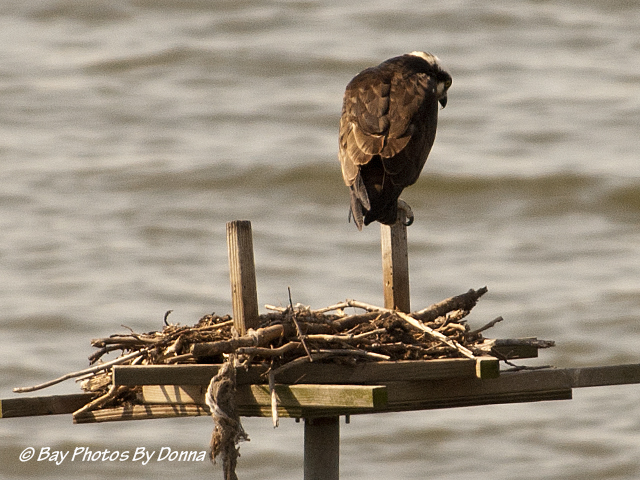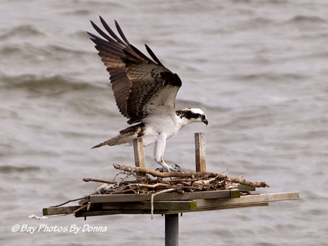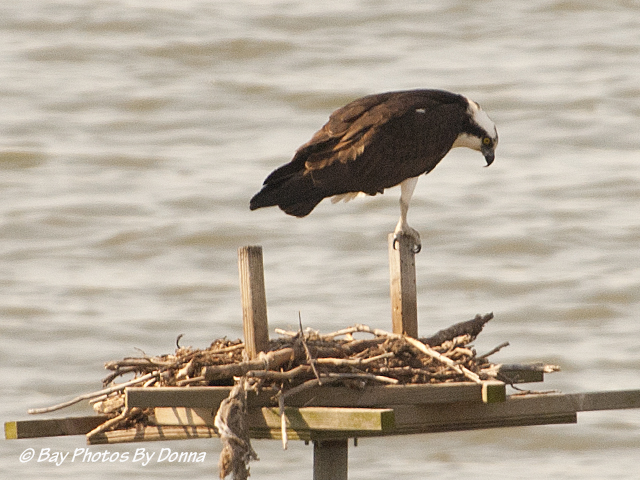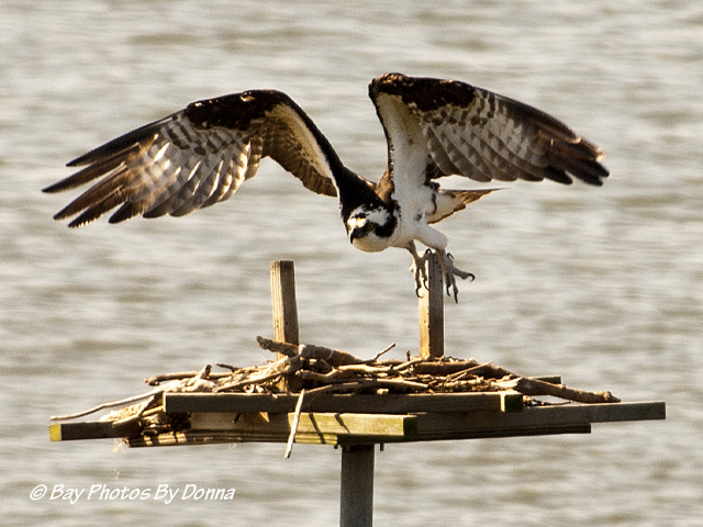 The osprey have come back from migration in good numbers this season in our Kent Narrows/Grasonville, Maryland, area. Whether home, driving around the area, or about the docks and restaurants (the tiki bars have opened!), osprey are in the sky everywhere, searching for or carrying back fish, as well as nesting materials to build their nests stronger with their impending offspring soon to arrive. With binoculars, I can watch the activity of three osprey nests at a distance from my balcony, each having a mate on their nest at all times, indicating they are incubating eggs. Last year, our Olivia laid her first of two eggs April 3rd, with that first one hatching May 8. So in the next 2-4 weeks, there will be many osprey chicks hatching in the mid-Chesapeake Bay waterways, they’ll be hungry & ready for some fish. Get ready osprey dads! Not only does the dad do most of the fishing for the chicks (mom does the feeding), but he will also continue to work hard on building the sides of the nest steeper to keep the curious chicks inside longer.