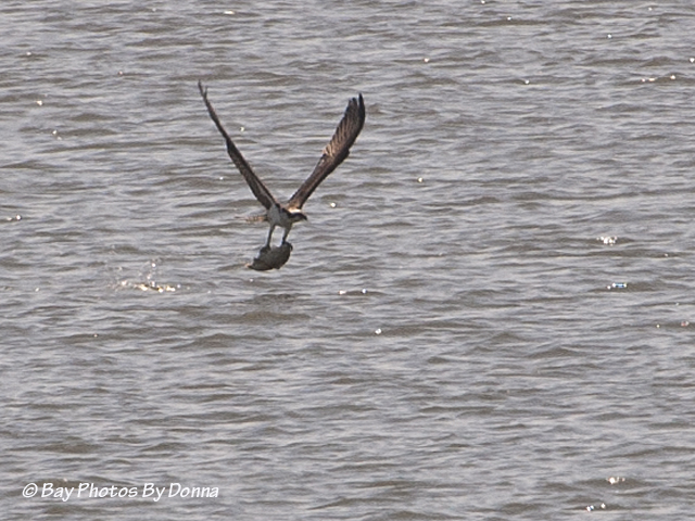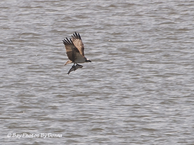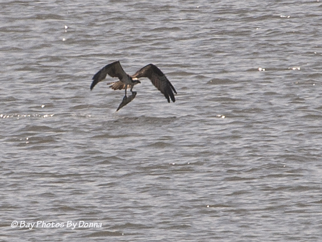 The osprey dive & fish capture is a sight to behold. So far this season, I’ve watched the dive but wasn’t camera-prepared before the plunge. Here’s a series of shots after the plunge. These were shot at a distance so the photos are a bit grainy after cropping, but the series shows the osprey’s success! By the way, this osprey is one of the pair that is on Kent Narrows channel marker #3 from the first photo. The mate was on egg-duty.