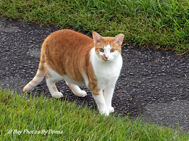 We do have a few feral cats on the property. Our management doesn’t do anything about them, and we have some neighbors that feed them. So of course they are happy and have no reason to leave. They are very skittish so it’s almost impossible to get close to one; and 95% of the time, they stay hidden out of sight. I happen to catch this one out & about early one morning. He heard my camera shutter, looked up, and was gone! (UPDATE – His name is Lucky, he’s lived 10 years at OC, and he is neutered!)