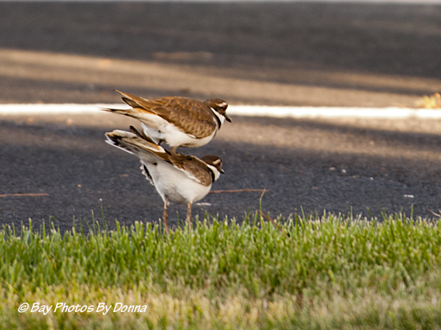 The two killdeer I was photographing were enjoying the early morning sunrise it seemed. Then along came a third larger killdeer who flew into the parking lot area, causing the other two to run quickly to get close together. I assumed I was going to see a territorial ruckus but that wasn’t the case. The third killdeer boldly ran over to the other two who were watching him and proceeded to mate with one (who allowed it!) while the other one just stood there and watched. This behavior was surely confusing to me, and it looked like to the by-stander killdeer too!