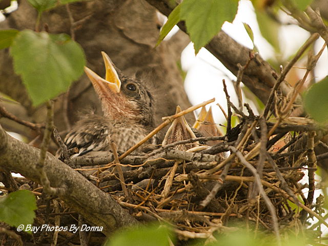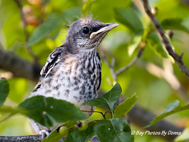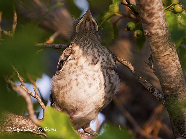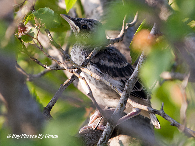 I needn’t worry. I found all three out of the nest, each perched on a different branch. They knew what to do. I found one of the parents perched up on the tennis courts fence, watching over them. I slowly positioned and was able to get a shot of each one, and then quickly left. Here’s the three little ones….