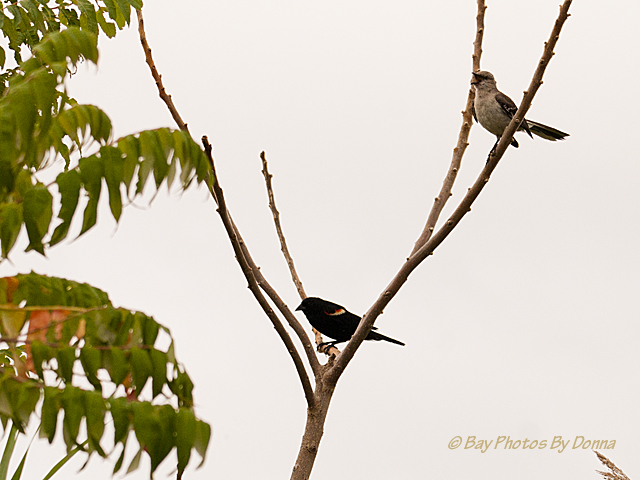 I’ve taken many photos of this pair, but have also just sat and watched as they busily fly from branch to branch, keeping their territory protected. Although they chase others, I’ve watched this pair reside alongside a pair of red-winged blackbirds who are nesting 12 feet away, and a pair of pigeons who are nesting 20 feet away. Here’s a shot of one of the mockingbirds perched with the male red-winged blackbird. (The red-winged blackbird’s nest is located below and to the left in the photo.)