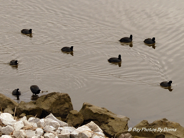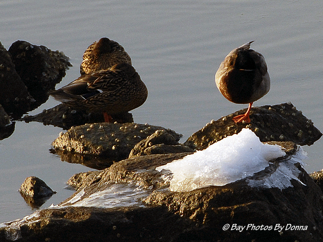 With so many Mallard Ducks around all year round, I tend to not photograph them often. With the temps in the upper teens early one morning, I watched these curled up sleepers on the berm under the osprey platform. On the rocks are barnacles.