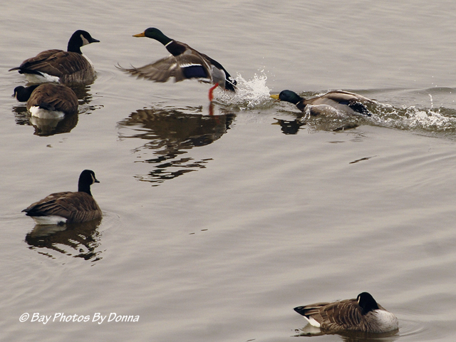 Fighting Male Mallards amongst Canada Geese