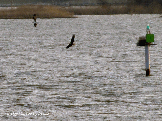 I quickly checked and found our platform empty. But I did sight an Osprey on the Kent Narrows South Entrance channel marker and two American Bald Eagles on the Prospect Bay channel marker (I need binoculars to see this one). Both of these channel markers had active Osprey nests last year which are still intact.