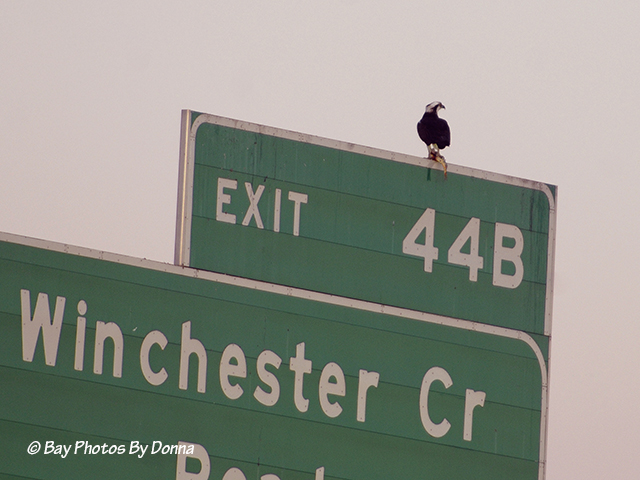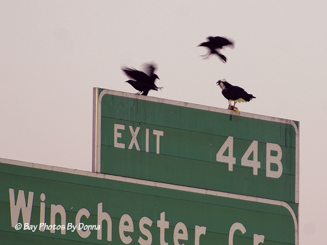 One blackbird flew and attempted to land on the sign. The Osprey didn’t care. So another and another and another flew over. They thought maybe the Osprey was going to share his fish?