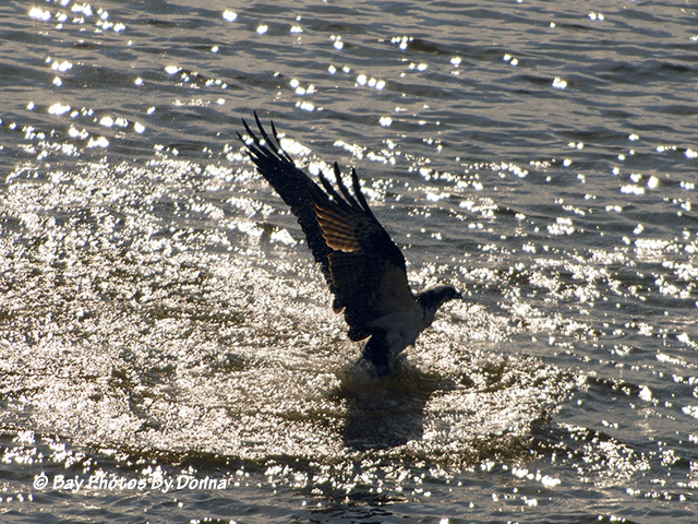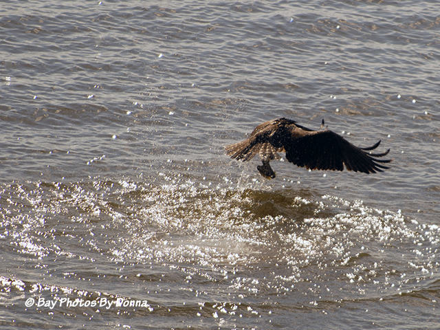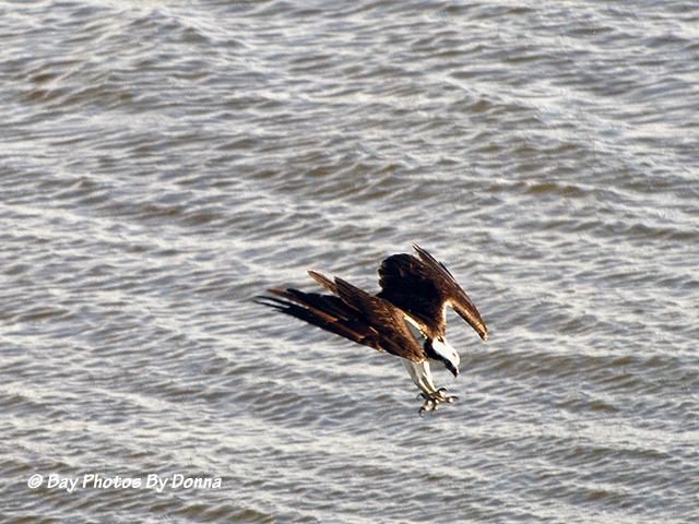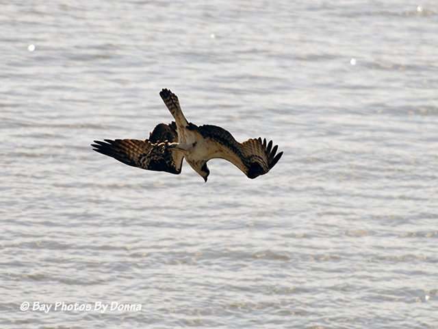 The Osprey dines almost exclusively on live fish, often catching its meals by hovering over the water at an altitude of 50 to 200 feet, then diving feetfirst into the water to catch its prey. It is very entertaining to watch them in action. AND very challenging to photograph! Here are a few of my attempts at trying, to show their form and technique.