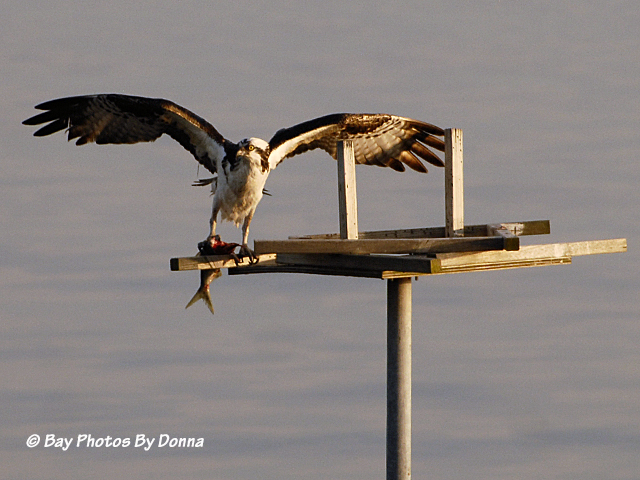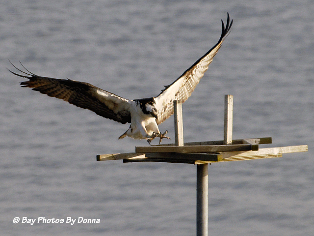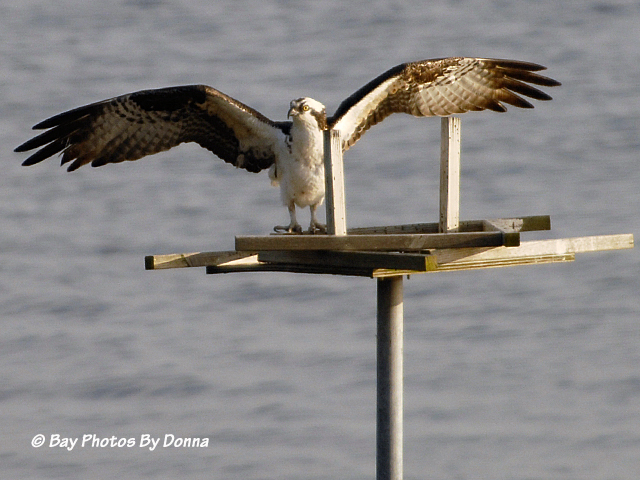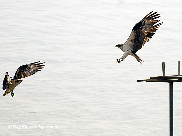 For the last eight weeks, the surrounding Chesapeake Bay have welcomed back and been entertained by the Osprey. They are easily sighted if you are in our area around the Kent Narrows waterways in the sky or perched on signs, buoys, channel markers, trees, and man-made nest platforms. We’ve not had a pair of Osprey take residence and build a nest on our nest platform this season, but I witnessed a few attempts. The first on was on April 7th, I shot them through a double-pane window so not to spook or disturb him which caused a focus problem, but it’s proof we’ve enticed interest!