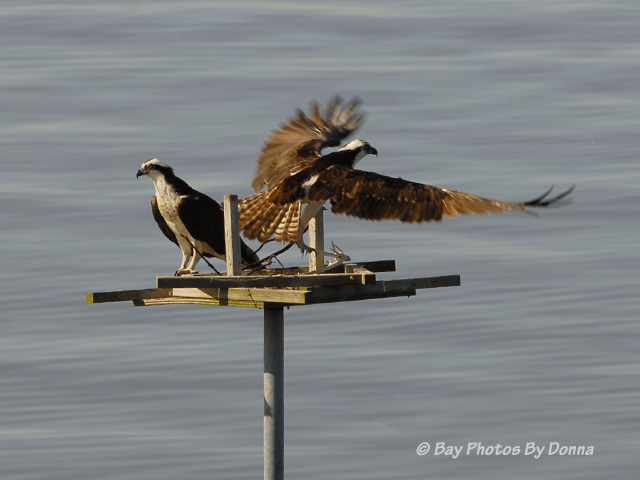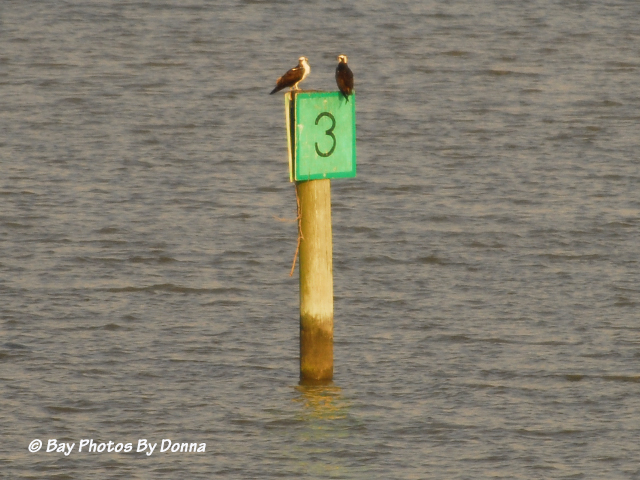 To start, this Osprey pair have actually been occupying Lippincott’s Channel Marker No. 3 that I can see at a distance off to the left of my balcony for some time. They stayed on that marker most of the time, and then would visit our platform to eat a fish and perch for a while. Back and forth I’ve watched them.