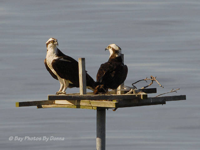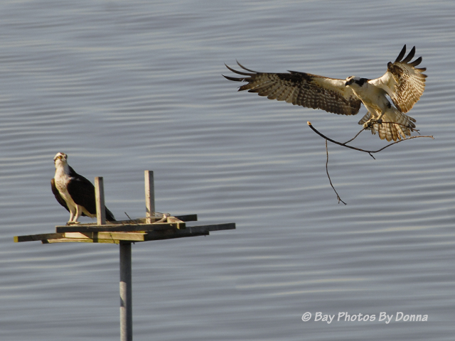 I’ve debated myself on whether to post on this just yet, as those of you who have followed my blog for some time know I’ve been wishing with fingers crossed that a pair of Osprey will find our community’s empty nest platform desirable as a home after our beloved previous Osprey pair, Oliver and Olivia, did not return last year. I don’t want to jinx! BUT since Memorial Day (May 27th) a pair of Osprey appear to have taken possession of the platform and have started making a nest. 🙂