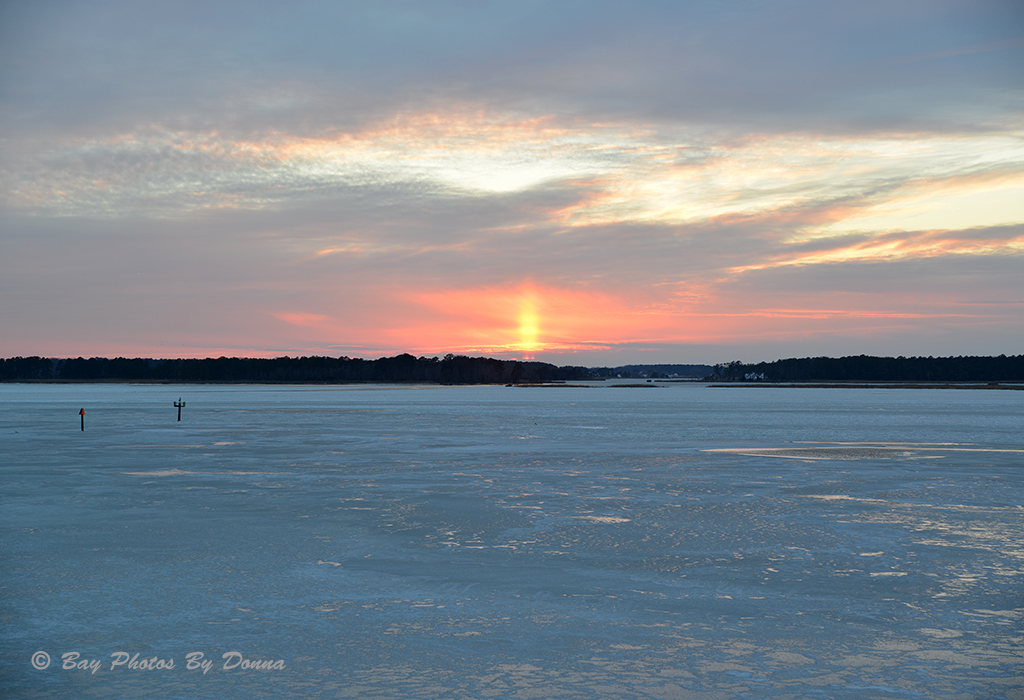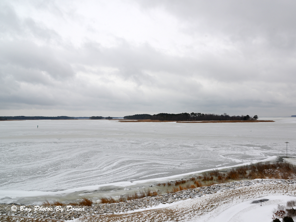 When it gets REAL cold along the tidal tributaries of the Chesapeake Bay, our creeks, coves and rivers can build up lots of ice and even appear to freeze-over. Our country’s present deep-freeze arctic temps are providing the perfect conditions. It’s been interesting seeing photos of other bodies of water around the country doing the same thing. (Those of Niagara Falls were unbelievable!) So I thought I’d share three wide-angle photos I took today from my balcony of my local area’s freeze-overs. You can see the ice effects of the tidal waters that continue beneath, as the ice lifts and lowers. There are dark open ‘pools’ of water here & there; and along the background to my right, the ice is chopped up as it rolls with the tides down from Kent Narrows to Prospect Bay to Eastern Bay to the open waters of the Chesapeake Bay and then back again. Marshy Creek actually is more of a cove as shown, and it does look like it’s pretty much frozen over.