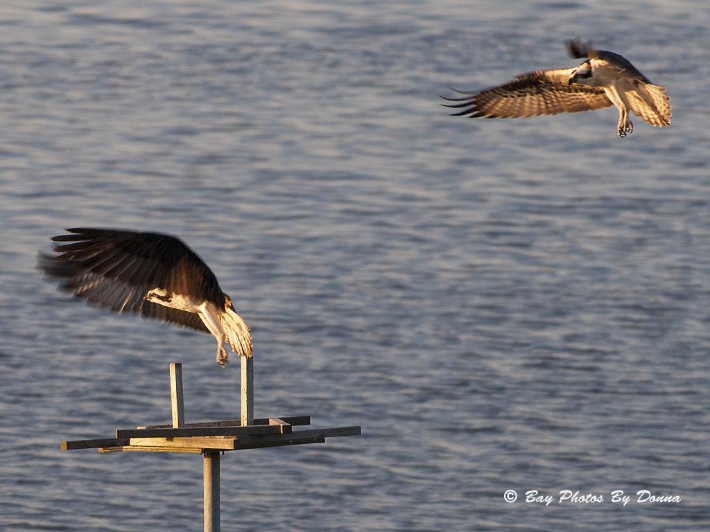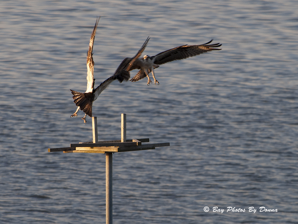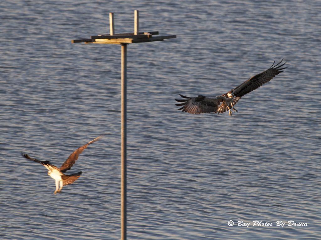 The Eagle got tired of the Osprey and followed his mate in the sky. The male Osprey flew back to his platform in triumph.