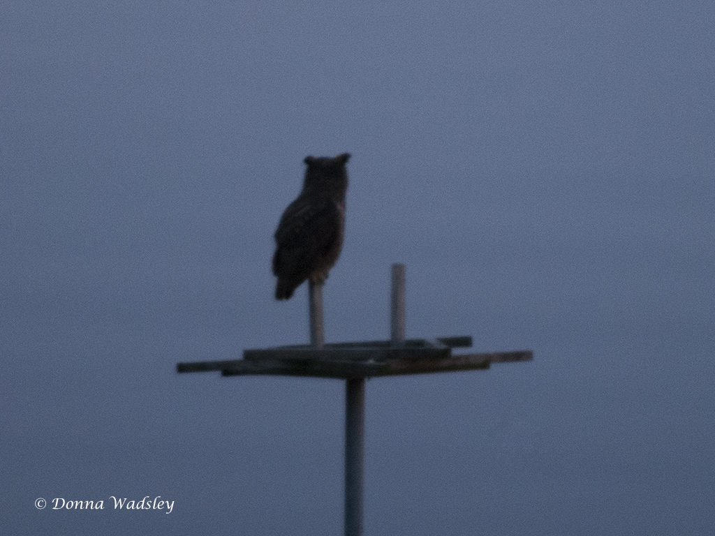 Looking out my window on a recent clear night, I thought I could make out a large shadow on the platform. Cool, I thought. I grabbed my binoculars to see if I could identify it and could make out the shape of an owl. He never made a sound and sat there for over an hour. I’m not able to identify what owl species. I know we have Great Horned Owls across Marshy Creek at CBEC, so maybe a GHO?