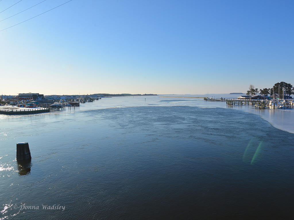 Although both ends of the Channel were pretty much frozen over, near the Rt. 18 and Rt. 50 Bridges, centerpoint of the Kent Narrows Channel, the tides’ currents were doing a great job keeping the waters open at the bridges’ bases. Those pretty swift currents run up to 8-10 mph during its high-end speed.
