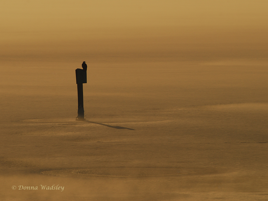 I showed a distant shot in my last post of the fog rolling across frozen Marshy Creek last Wednesday morning. I took a few more of an American Bald Eagle perched on Lippincott Marina’s entrance channel marker when the sun was rising.
